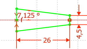Es zeigte sich aber, dass der "krumme" Winkel 7,12502…° in den folgenden Schritten schwierig zu handhaben ist. Deshalb wurde der Winkel auf genau 7,125° geändert und stattdessen das überflüssige Maß 11 entfernt.