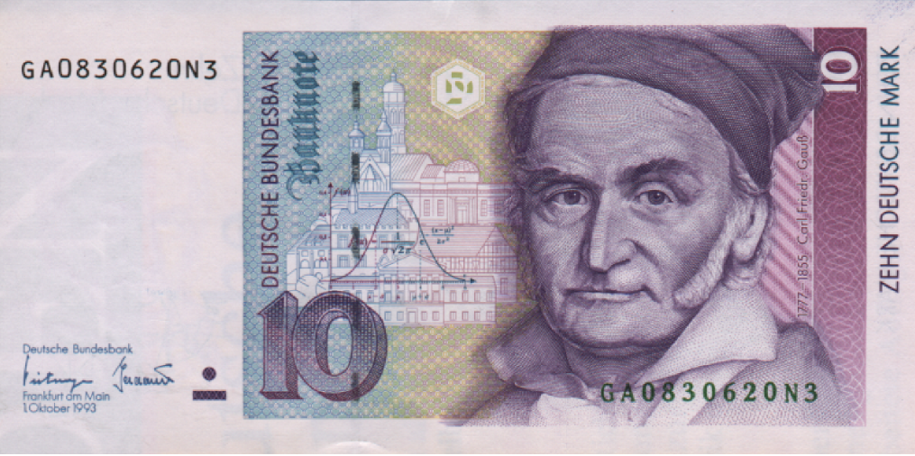 - Download Folie: 10-DM-Schein mit dem Porträt von Carl Friedrich Gauß und mit Formel und Kurve der Normalverteilung.