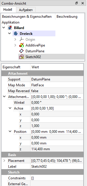 → Die neu erstellte Skizze wird gleich wieder geschlossen, weil Skizzen nicht wie Ebenen mittels ihrer Maske verschoben werden können. Dazu müssen die Eigenschaften(-Ansicht) der Skizze herhalten: - Baumansicht - Sketch002 markieren