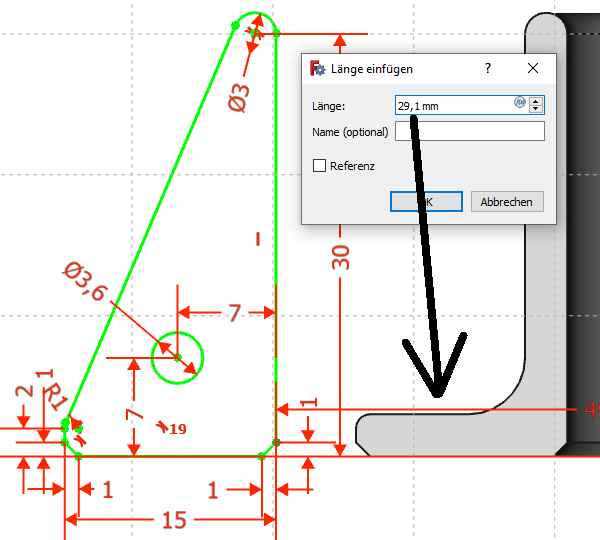 Auch die Kontur des Flansches könnte man parametrisch in die Skizze übernehmen und dann die Bohrung und die Form der Rippe ergänzen. Aber ich habe mit dem topologischen Benennungsproblem schon so viele sinnlose Stunden verbraten, dass ich die Skizze lieber neu erstelle.
