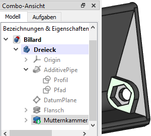 Auf die Stirnseite eines der beiden Schenkel wird eine Rippe bzw. ein Flansch angebracht, mit dem die Teilstücke des Billard-Dreieckes verschraubt werden können. Der zweite Flansch wird später durch Spiegelung erzeugt.