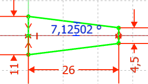 Es zeigte sich aber, dass der "krumme" Winkel 7,12502…° in den folgenden Schritten schwierig zu handhaben ist. Deshalb wurde der Winkel auf genau 7,125° geändert und stattdessen das überflüssige Maß 11 entfernt.